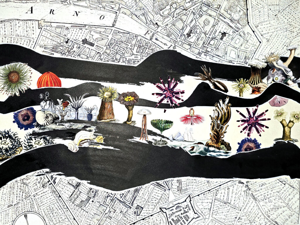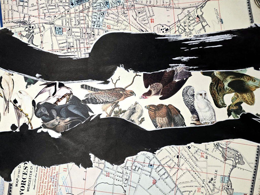 Each collage in the Habitat series centers on an animal—or group of animals—whose living range is being reduced or reshaped through human activity. These figures are drawn from archival image sources, including the New York Public Library and the Library of Congress, then carefully isolated and reprinted on inkjet washi. Removed from their original contexts, they become both specimen and witness.